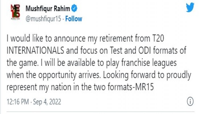 বাংলাদেশের হয়ে ১০২ টি টি-২০ ম্যাচ খেলা উইকেটরক্ষক কাম ব্যাটসম্যান মুশফিকুর রহীম টি-২০ থেকে অবসরের ঘোষনা দিয়েছেন। সামাজিক যোগাযোগ মাধ্যম মুশফিকের ভেরিফাইড টুইটার ও ফেসবুকে ওই ঘোষনা দেন তিনি। ২০০৬ সনে খুলনায় জিম্বাবুয়ের বিরুদ্ধে টি-২০ ভার্সানে অভিষেক ঘটে মুশফিক। সেটা অবশ্য বাংলাদেশেরও প্রথম টি-২০ ম্যাচ ছিল।
