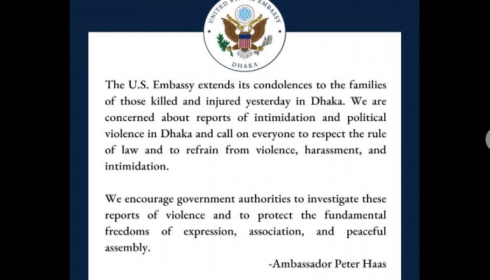 “যুক্তরাষ্ট্র দূতাবাস গত ৭ ডিসেম্বর ঢাকায় নিহত ও আহতদের পরিবারবর্গের প্রতি সমবেদনা জানাচ্ছে। আমরা ঢাকায় ভয়ভীতি প্রদর্শন ও রাজনৈতিক সহিংসতার খবরে উদ্বিগ্ন এবং আইনের শাসনকে সম্মান জানাতে এবং সহিংসতা, হয়রানি ও ভয় দেখানো থেকে বিরত থাকতে সবার প্রতি আহ্বান জানাচ্ছি।